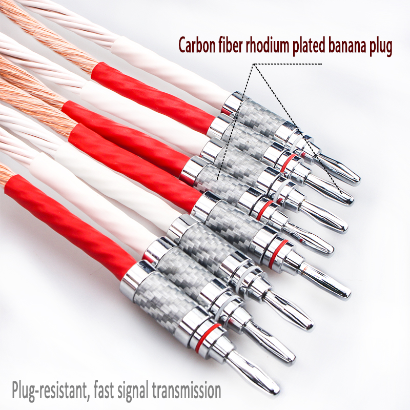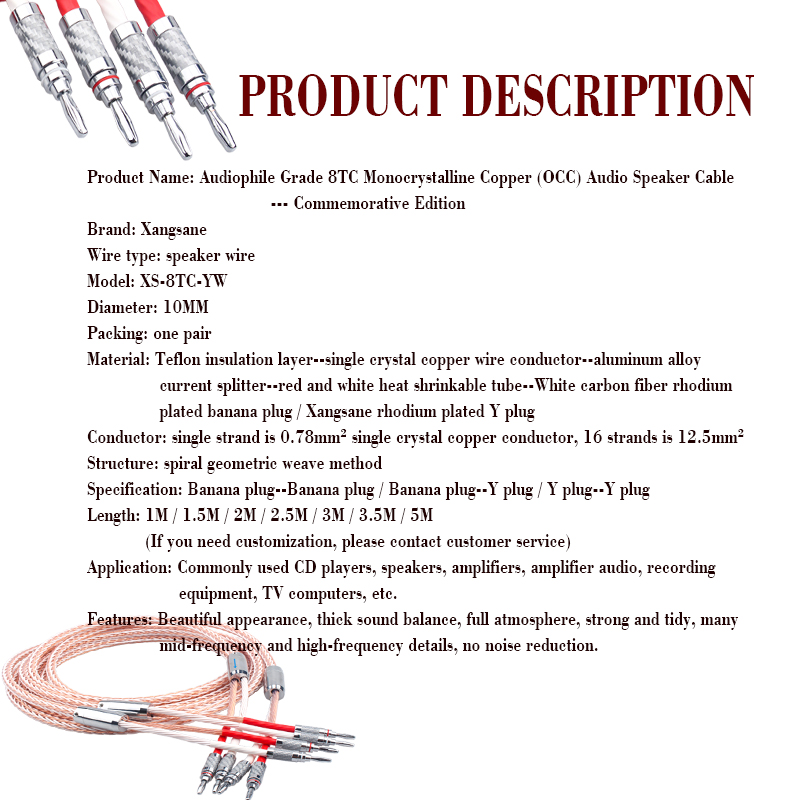 Product Name: Audiophile Grade 8TC Monocrystalline Copper (OCC) Audio Speaker Cable --- Commemorative Edition Brand: Xangsane Wire type: speaker wire Model: XS-8TC-YW Diameter: 10MM Packing: one pair Material: Teflon insulation layer-single crystal copper wire conductor-aluminum alloy current splitter-red and white heat shrinkable tube-white carbon fiber rhodium plated banana plug / Xangsane rhodium plated Y plug Conductor: single strand is 0.78mm² single crystal copper conductor, 16 strands is 12.5mm² Structure: spiral geometric weave method Specification: Banana plug--Banana plug / Banana plug--Y plug / Y plug--Y plug Length: 1M / 1.5M / 2M / 2.5M / 3M / 3.5M / 5M (If you need customization, please contact customer service) Application: Commonly used CD players, speakers, amplifiers, amplifier audio, recording equipment, TV computers, etc. Features: Beautiful appearance, thick sound balance, full atmosphere, strong and tidy, many mid-frequency and high-frequency details, no noise reduction.